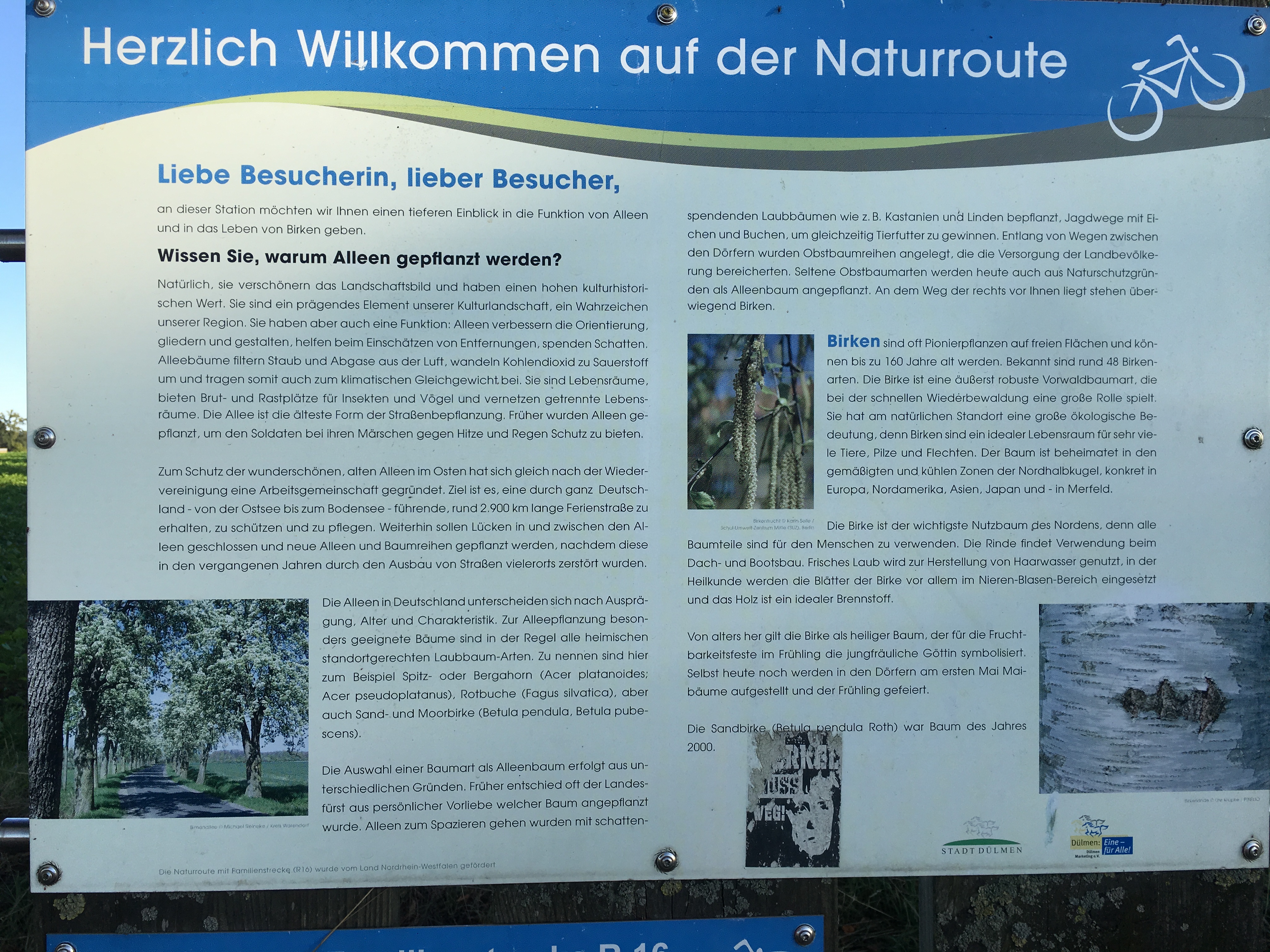"Zahlreiche Alleen sind in der Vergangenheit dem Straßenverkehr zum Opfer gefallen. Die noch vorhandenen Alleen werden in Nordrhein-Westfalen in einem Kataster erfasst und unter gesetzlichen Schutz gestellt. Das NRW Alleenprogramm fördert darüber hinaus die Wiederherstellung sanierungsbedürftiger und die Anlage neuer Alleen" (aus „Alleen in NRW" S. 23).